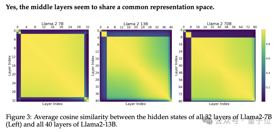 这表明模型可能对“开始”、“中间”和“结束”层具有三个不同的表征空间。研究人员还发现,“开始层”的数量似乎随着模型总层数的增加而增加。