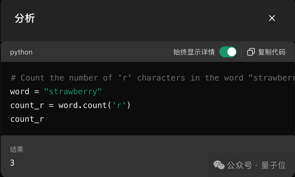 可以看到,ChatGPT直接用Python语言字符串的count函数,就能简单搞定。