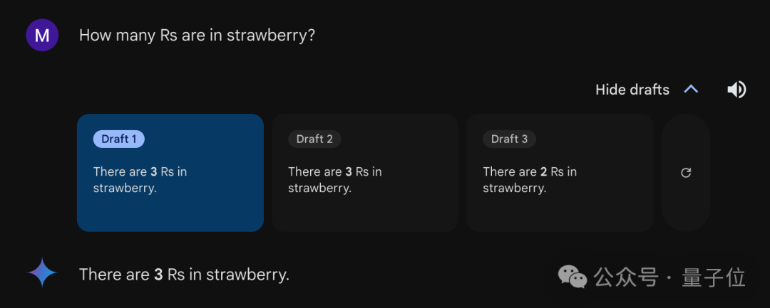 谷歌Gemini 大概有三分之二的概率能答对,打开“草稿”就能发现,默认每个问题回答三次,两次对一次错。