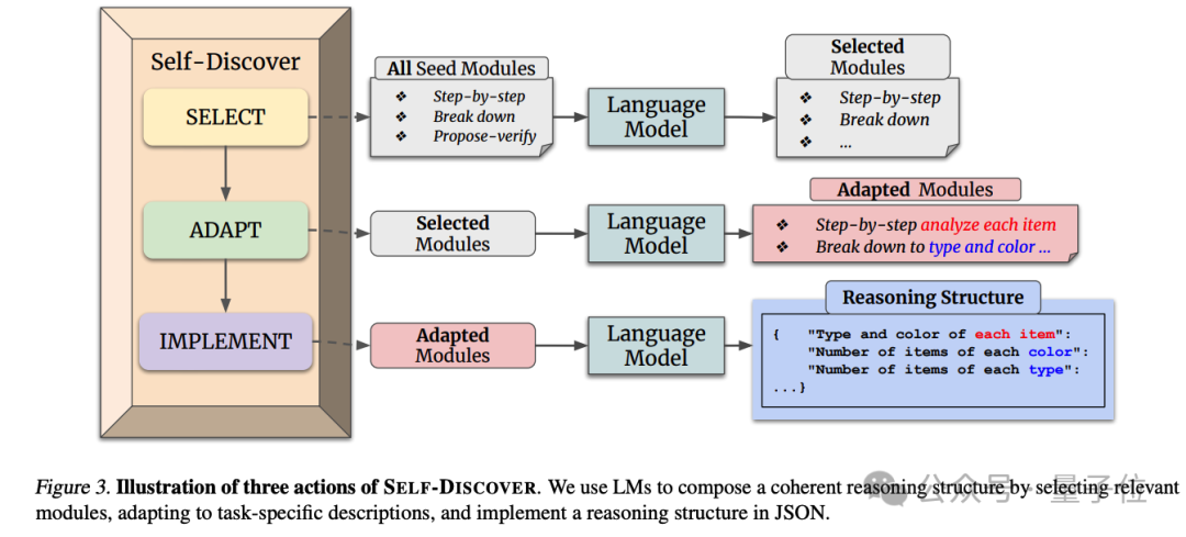 整个方法分为两大阶段:先针对特定任务让AI自我发现推理步骤,第二阶段再具体执行。