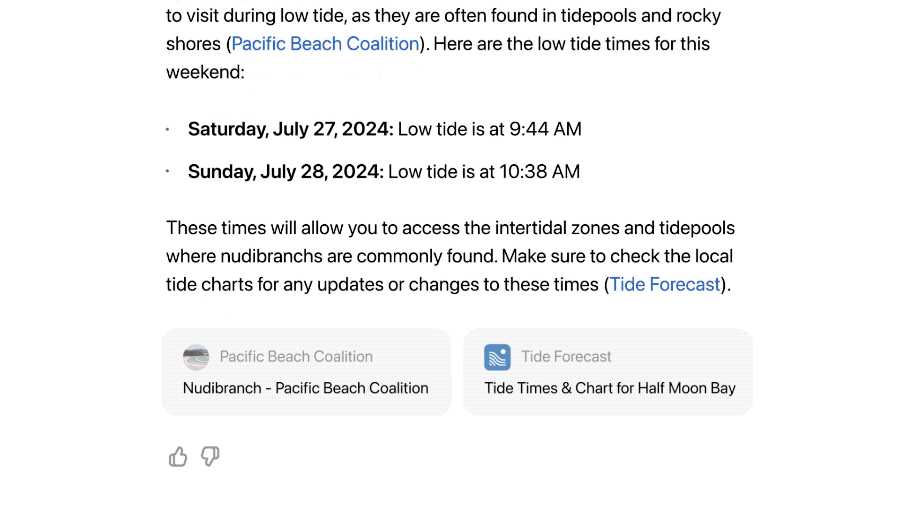 也没能像SearchGPT一样给出具体时间段,只是推荐在退潮期,倒是在其他相关注意事项上补充的很全。