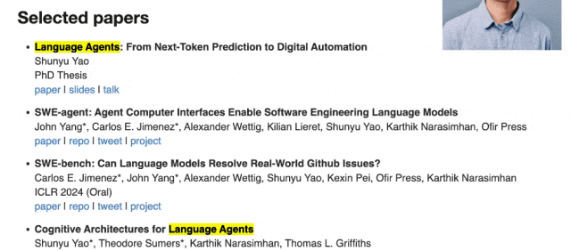 如果纵观姚顺雨的主页,尤其是论文研究部分,就不难发现有一个出镜频率极高的词组——Language Agents。