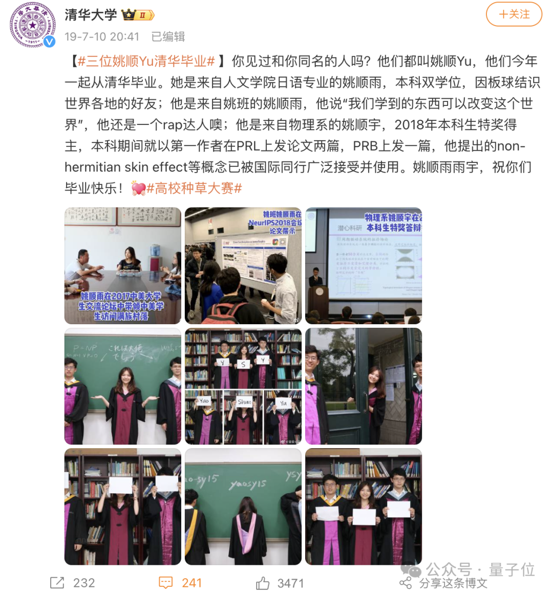 清华大学官方在2019年三位姚顺yu毕业时,发了一条微博,还晒了三人的合照。