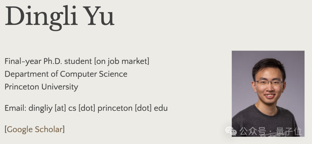 共同一作Dingli Yu,本科毕业于清华姚班,目前Dingli Yu也快要在普林斯顿计算机科学系博士毕业了。