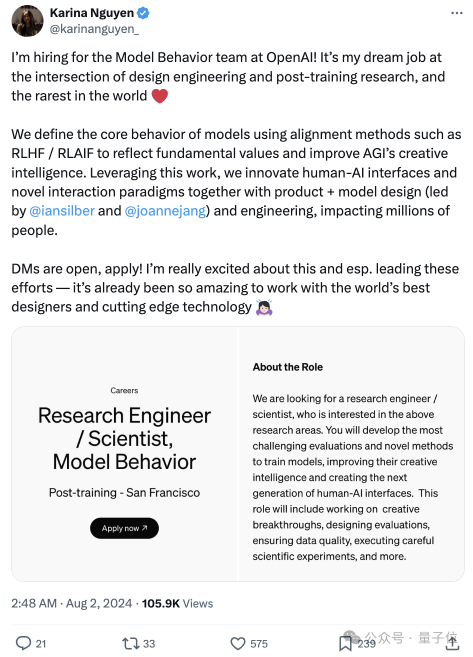 OpenAI工程师Karina Nguyen发布最新招聘帖: