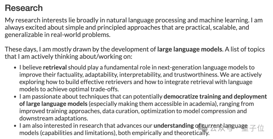 其个人主页显示,“这些天主要被开发大模型吸引”,正在研究主题包括: