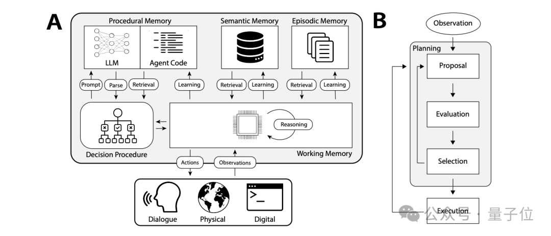 CoALA:一个概念框架,用于组织和设计语言代理,包括内存、行动空间和决策制定等方面。