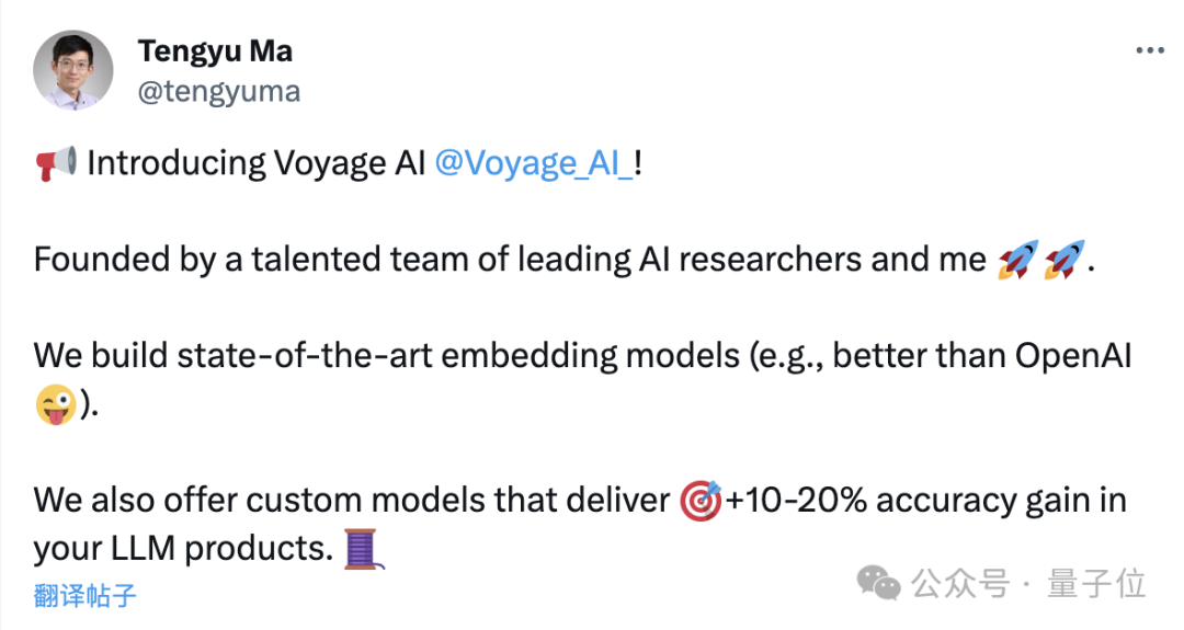 去年年底,马腾宇还正式宣布大模型创业了——创立Voyage AI,透露将带队打造目前最好的嵌入模型,还会提供专注于某个领域或企业的定制化模型。