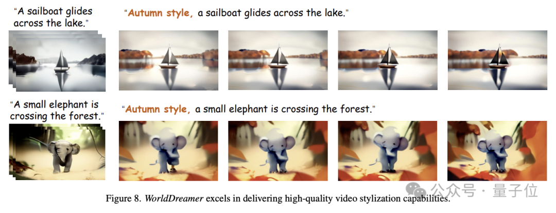 如下图所示,输入一个视频段,其中某些像素被随机掩码,WorldDreamer可以改变视频的风格,例如根据输入语言创建秋季主题效果。