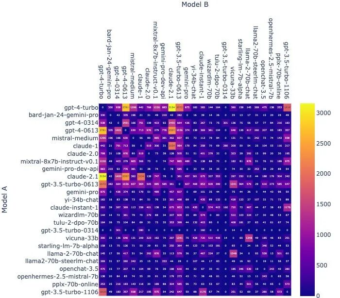 更详细一点,在所有没有平局的Model A对B的对决中,Model A获胜的比例如下: