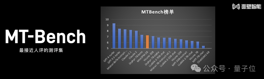 若不论大模型的尺寸,把主流的全部囊括进来,在最接近人评的测试集MT-Bench中比较,小钢炮也取得了较为不错的成绩: