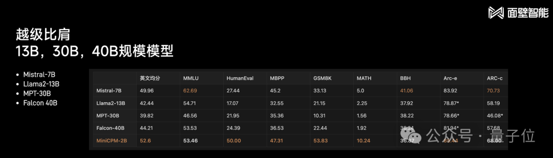 例如与同样是采用“以小博大”路数的大模型标杆之作Mistral-7B做比较,小钢炮多项标准测试成绩均胜出: