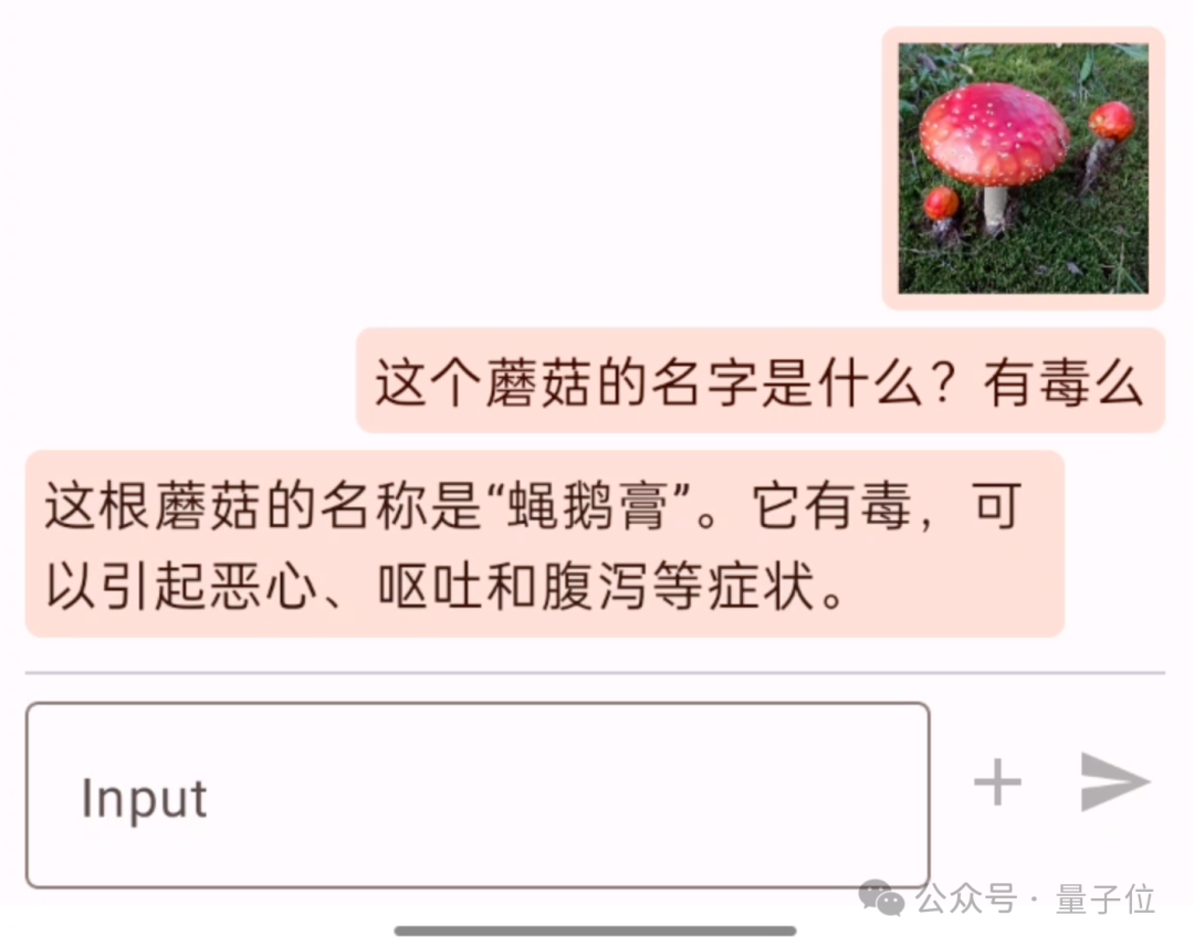 例如先“喂”给手机里的小钢炮一张图,并提问“这个蘑菇的名字是什么?有毒么”,小钢炮就会先看图再作答:
