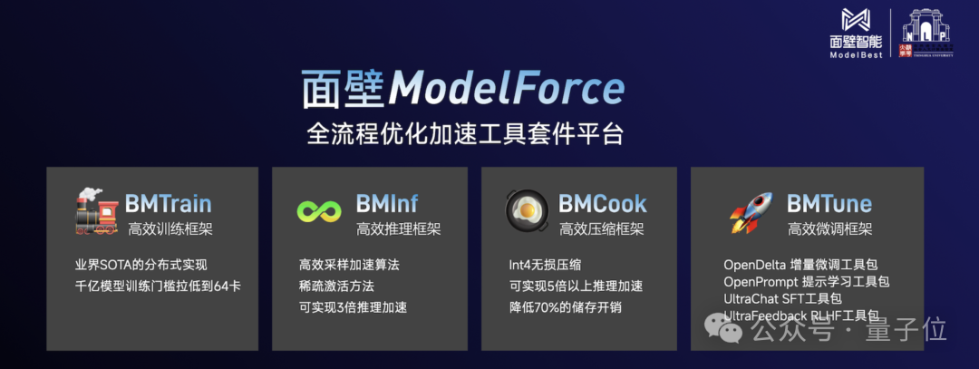 有这些具体的工具,便形成了面壁智能在算力层面的杀手锏——面壁ModelForce,全流程优化加速套件平台。