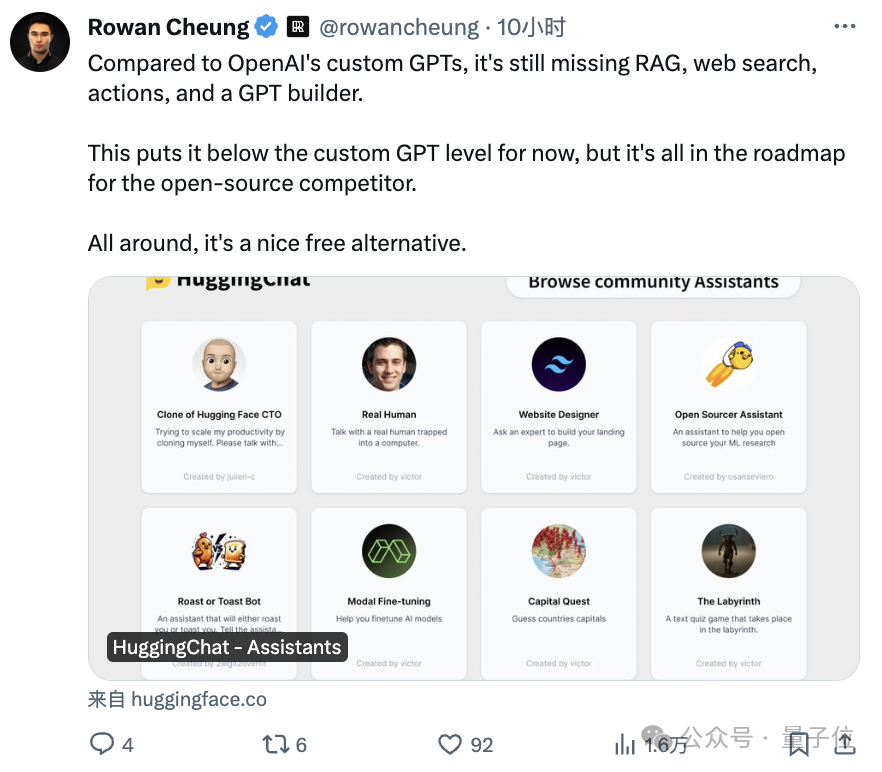 参考链接:[1]https://huggingface.co/chat/assistants[2]https://twitter.com/_philschmid/status/1753429249363452274[3]https://twitter.com/rowancheung/status/1753824289718227105[4]https://twitter.com/AI_NewsWaltz/status/1753488198758527311?s=20