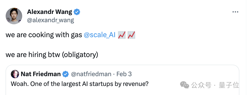 更有趣的事是,当“ScaleAI是收入最高的AI创业公司之一”被摆上台面后,一线冲浪的Alexandr火速转发了原推特,表示Scale正在加速前进,火力超猛的!