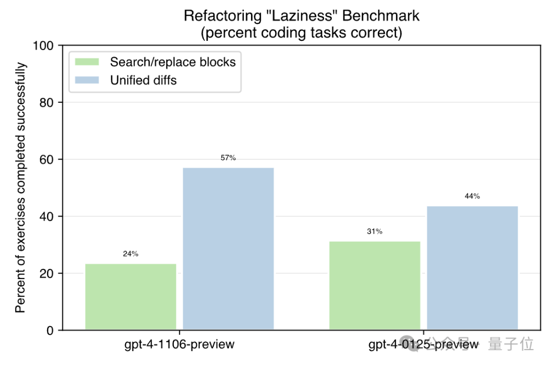 结果,对于其中的代码比较(Unified diffs)任务,旧版能完成的比例尚且超过了一半,为57%,新版的完成率却仅有44%,降低了近四分之一。
