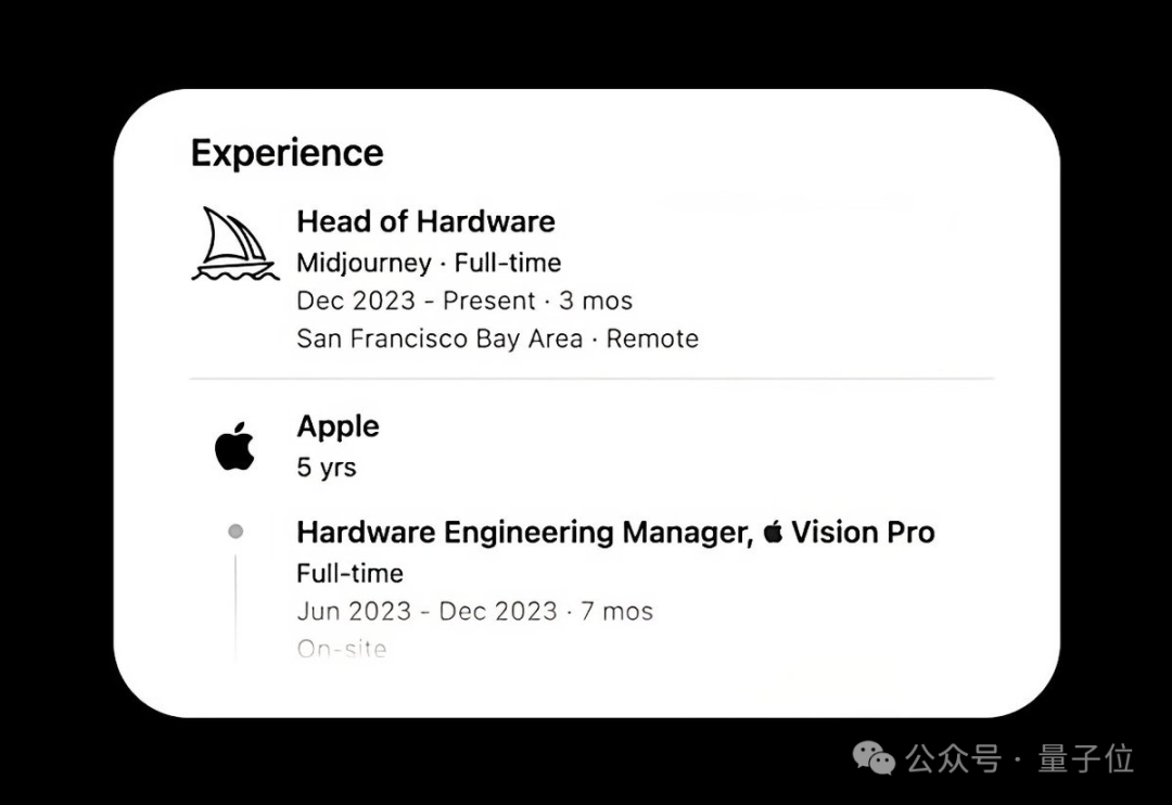 在被Midjourney挖走前,为苹果卖命5年的Abbas最后担任着硬件工程经理一职。