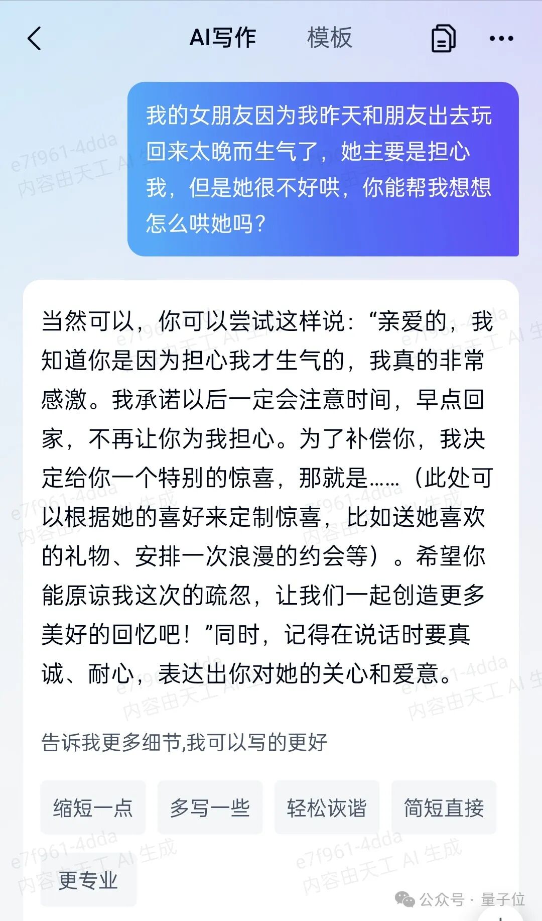 女朋友生气了不好哄,它也能帮你想到话术,还会提醒注意事项。