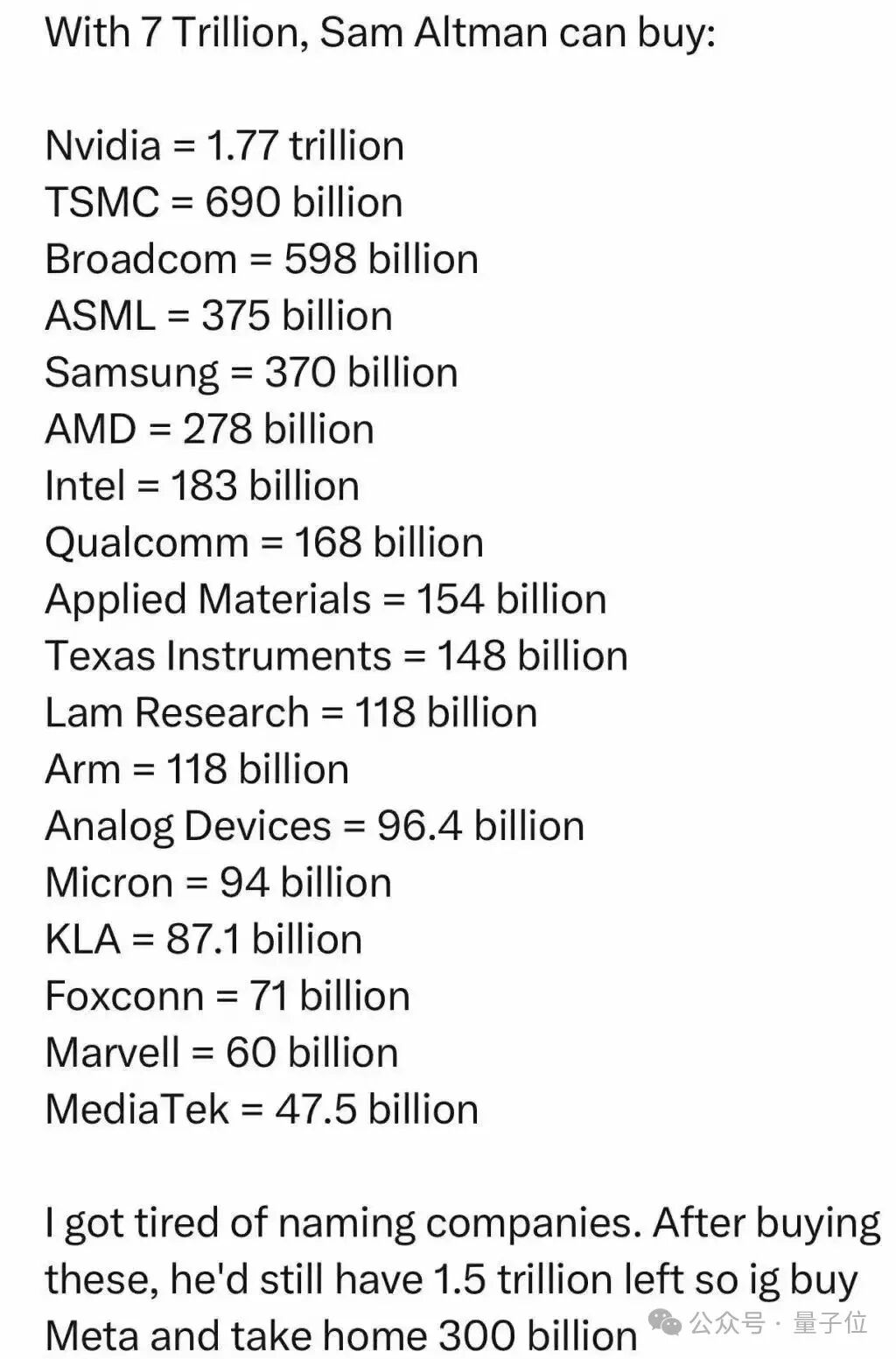 网友测算这些资金足以吞并英伟达+台积电+英特尔+三星+高通+博通+AMD+ASML等等等许多半导体头部公司之后,再顺手买个Meta,最后还有富余。