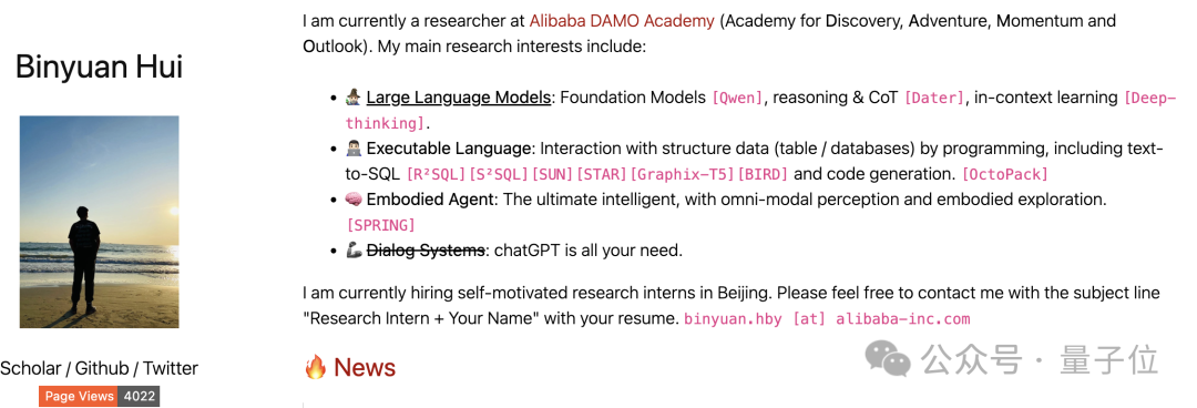 打开Binyuan Hui个人主页,可以看到Binyuan Hui是阿里达摩院的研究员,研究兴趣包括大语言模型、可执行语言、具身智能体等。