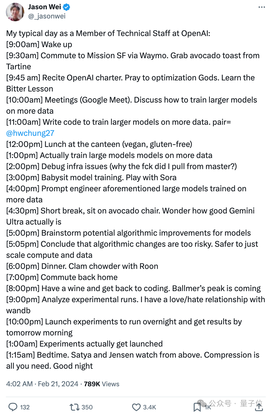 [9:00am] 醒来,可能会在床上多躺15分钟。[9:30am] 打车上班,浏览X了解世界上正在发生的事情,查看@_jasonwei的最新帖子。[10:00am] 工作开始,检查邮件,浏览arxiv,打开wandb查看昨天实验的结果。大多时候是叹气,但有时也有惊喜。[11:00am]开会讨论项目进展。[12:00pm] 在公司吃午饭。[1:00pm] 回去干活,可能敲代码或看论文。[2:00pm] 监督模型训练过程。[3:00pm] 开会讨论项目进展。[4:00pm] 喝咖啡休息。和优秀的研究者聊天,谈论他们最近的工作,寻找灵感。[5:00pm] 敲代码。[6:00pm] 在公司吃晚饭。[7:00pm] 监督模型训练过程。[8:00pm] 敲代码。[9:00pm] 看论文并与实习生讨论想法。[10:00pm] 坐地铁或打车回家。[11:00pm] 准备睡觉,玩手机。[12:00am] 最后检查,确保实验按预期进行。好吧,晚安。[12:30am] 被@JustinLin610发来的消息吵醒,他分享了刚想到的一个好的想法。[1:00am] 继续睡觉。[1:30am] 给@JustinLin610发消息,叫醒他,分享我刚想到的好的想法…