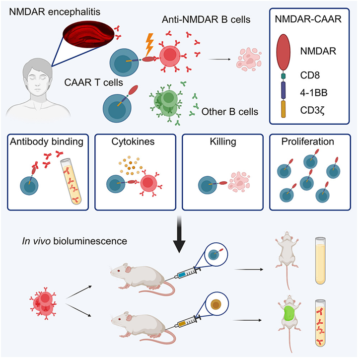 这些作者设计了专门的嵌合自身抗体受体(chimeric autoantibody receptor, CAAR)T细胞(CAAR-T),用于注射到患者体内。这些经过编程的CAAR-T细胞能高精度地识别并清除产生抗NMDA受体抗体的B细胞。在小鼠模型中,这种创新方法展示了它的准确性。