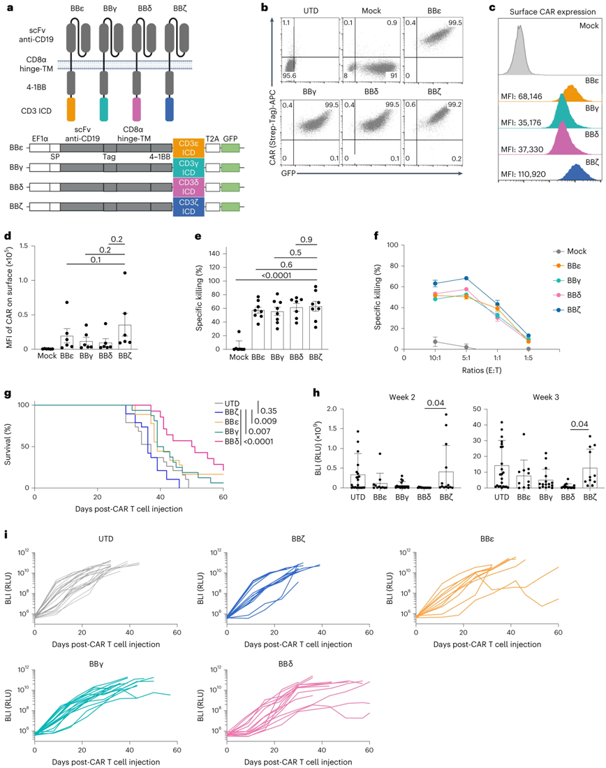 含有CD3δ/ε/γ细胞质胞内结构域的CAR优于含有ζ链的CAR。图片来自Nature Immunology, 2023, doi:10.1038/s41590-023-01658-z。