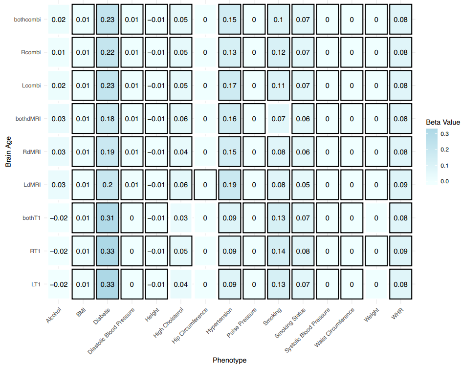 具体而言,对于男性来说,大脑年龄与高胆固醇水平、臀围尺寸、吸烟行为和体重等因素之间存在着敏感关系。这表示在男性中,这些生理和行为因素可能更加显著地影响大脑的衰老过程。这种性别差异的观察有助于我们深化对大脑年龄估计的理解,同时也提示在制定性别特定的预防和治疗策略时需要考虑到这些不同的影响因素。