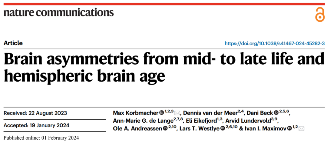 2. Korbmacher, M., van der Meer, D., Beck, D. et al. Brain asymmetries from mid- to late life and hemispheric brain age. Nat Commun 15, 956 (2024). https://doi.org/10.1038/s41467-024-45282-3