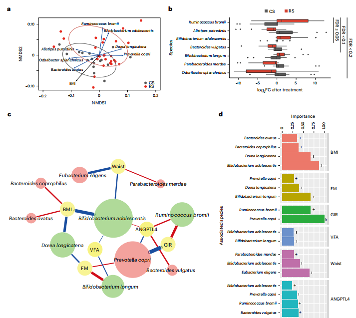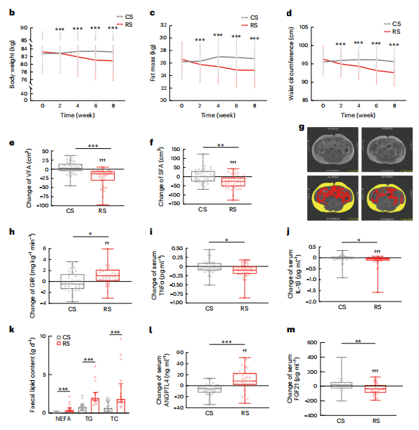 研究人员进一步用CS和RS干预后参与者的粪便喂养小鼠,发现接受RS微生物群的小鼠的体重和脂肪量低于接受CS微生物群的小鼠,且其葡萄糖耐量也得到了改善,说明RS诱导的肠道微生物群的变化足以缓解宿主肥胖和改善宿主葡萄糖代谢。