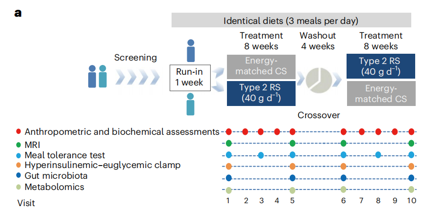 目前,有不少研究指出,与可消化淀粉相⽐,使用抗性淀粉有助于减脂,尤其是内脏脂肪。但是抗性淀粉RS作为⼀种功能性、适应性强的食用成分在⼈类肥胖治疗方面的潜力,以及其对人体代谢的调节机制仍不清楚。因此,在本研究中,研究人员以RS作为膳⻝补充剂对肥胖和其他代谢表型的影响及其机制进行了探究。