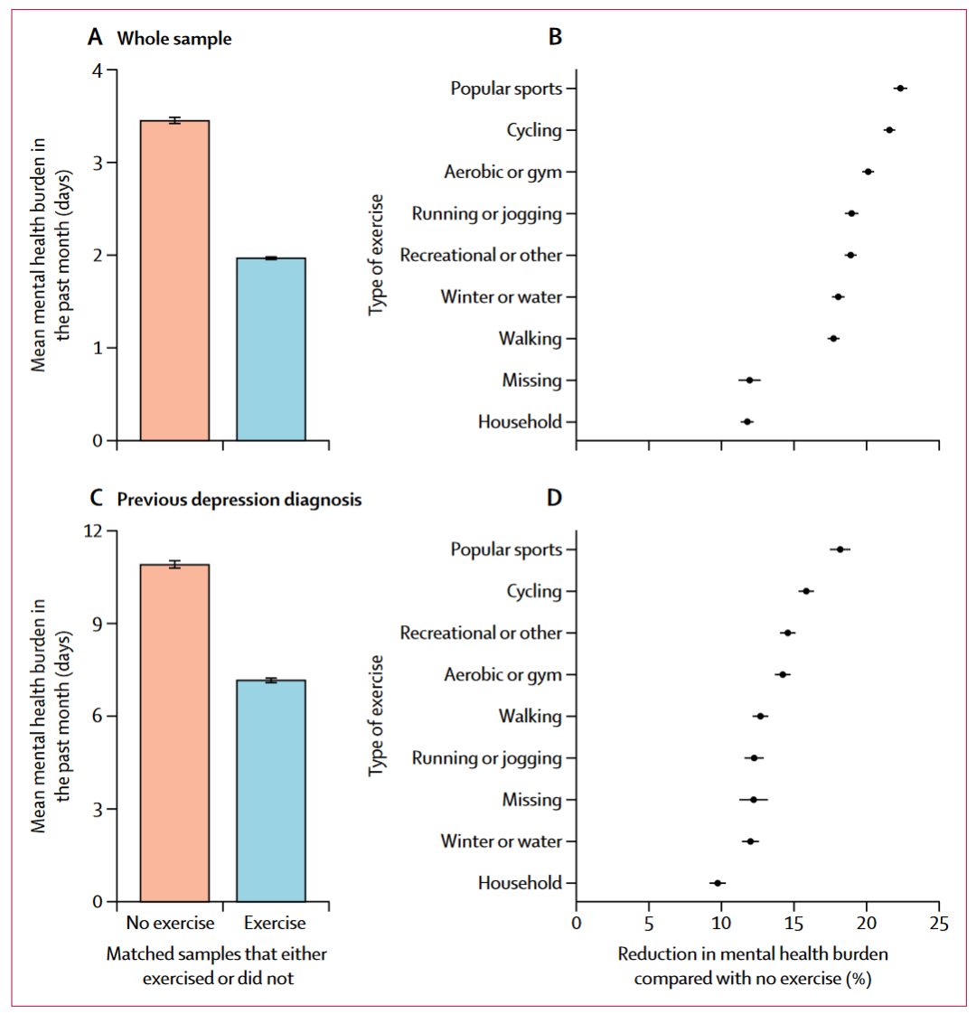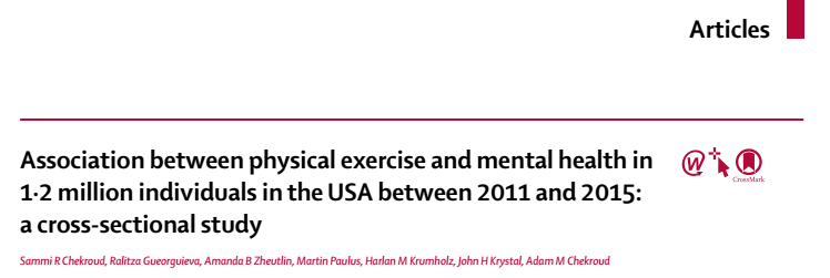 Chekroud SR, Gueorguieva R, Zheutlin AB, et al. Association between physical exercise and mental health in 1·2 million individuals in the USA between 2011 and 2015: a cross-sectional study. Lancet Psychiatry. 2018;5(9):739-746. doi:10.1016/S2215-0366(18)30227-X