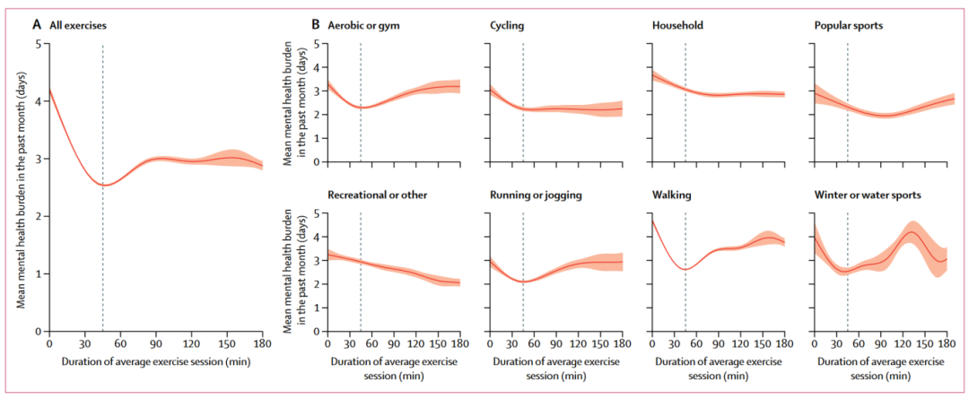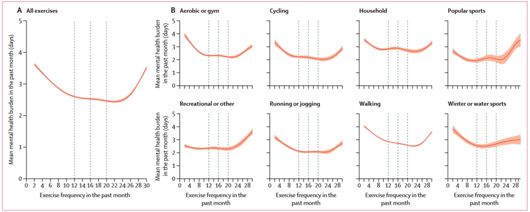 研究还观察到了锻炼频率与心理健康负担之间的U型关系,即每周锻炼3-5次的个体比每周锻炼<3次或>5次的个体有更低的心理健康负担。