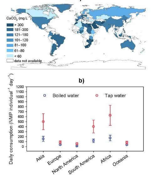 根据全球不同的水质和用水习惯,研究人员比较了六大洲共67个地区的成人和儿童饮用开水和自来水摄入的NMPs量,发现每天通过开水摄入的NMPs量比通过自来水摄入的微塑料量少2-5倍。此外,研究人员根据研究所得结果提出了建议:在煮沸之后,建议采用过滤装置,用以防止不小心摄入煮沸后的水中保留的NMPs外壳。