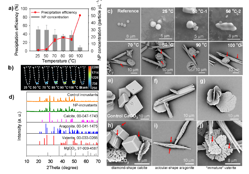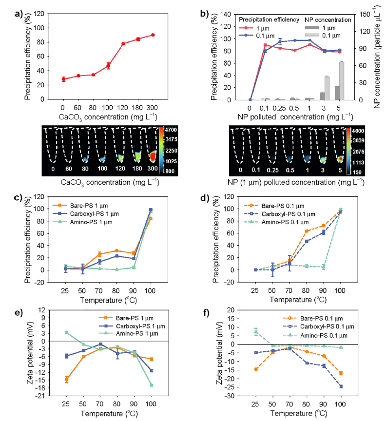 不同地区的饮用水硬度差异很大,而研究人员发现NMPs的沉淀效率会随着沸水硬度的增加而增加,当水中碳酸钙浓度为80mg/L、180 mg/L、300mg/L时沸水NMPs去除率为34%、84%和90%。但即使使用软水(碳酸钙浓度<60mg/L),煮沸仍能去除25%以上的NMPs。但碳酸钙含量有限,结合的NMPs有限,因此还存在着其他影响因素。对此,研究人员进一步发现高温还会增加NMPs的碰撞频率和附着,NMPs们可能聚集并增大尺寸,最终在重力影响下出现沉降。