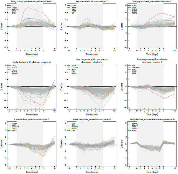 有意思的是,研究人员还检测到血浆瘦素水平显著降低,并在第4天降到最低点。进一步地,研究人对 1034 个显著变化的蛋白质的变化轨迹进行了分析,这些变化反映了机体对持续禁食的动态适应性改变。