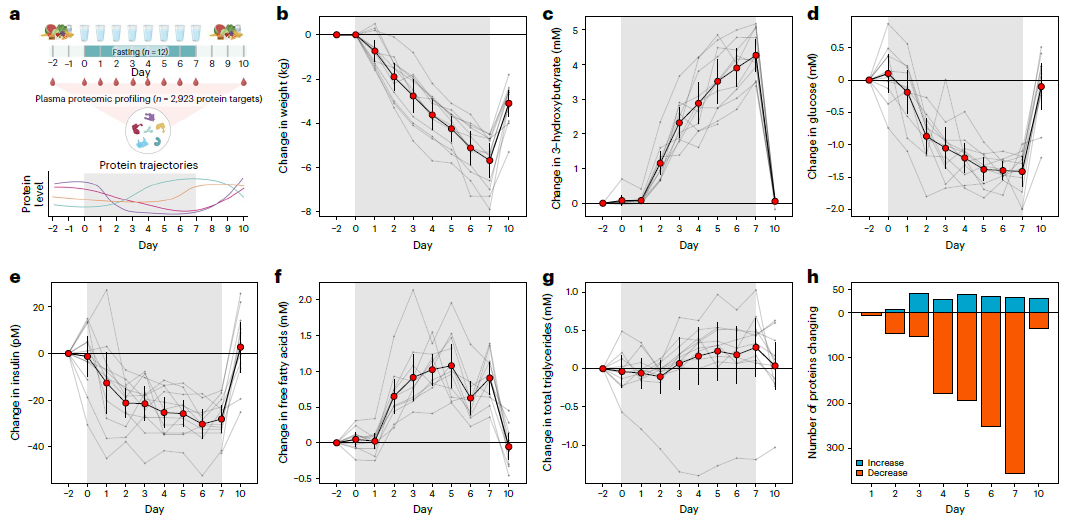 在这项研究中,研究人员选取了5名女性和7名男性志愿者(无任何已知疾病且女性体脂高于 15%,男性高于 12%),平均体重为77.5公斤。研究人员设定了严格的只允许饮水的7 天禁食方案,并在研究开始的前 2 天、研究期间的每一天以及禁食结束随意进食 3 天后对空腹血液样本进行采样后禁食蛋白质组学测序,以及数据分析。