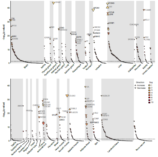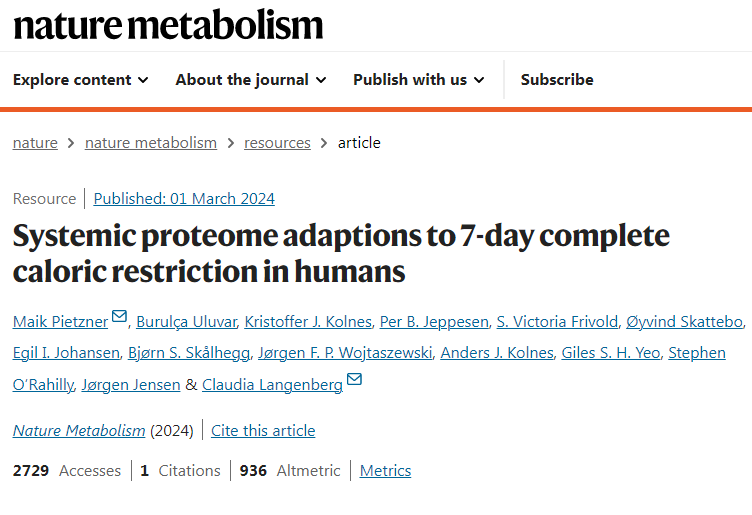 [2] Pietzner, M., Uluvar, B., Kolnes, K.J. et al. Systemic proteome adaptions to 7-day complete caloric restriction in humans. Nat Metab (2024). https://doi.org/10.1038/s42255-024-01008-9