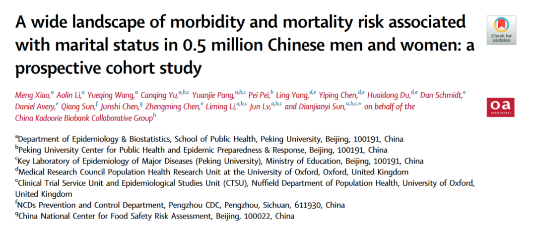 该研究成果发表在著名期刊柳叶刀上,题为“A wide landscape of morbidity and mortality risk associated with marital status in 0.5 million Chinese men and women: a prospective cohort study”。