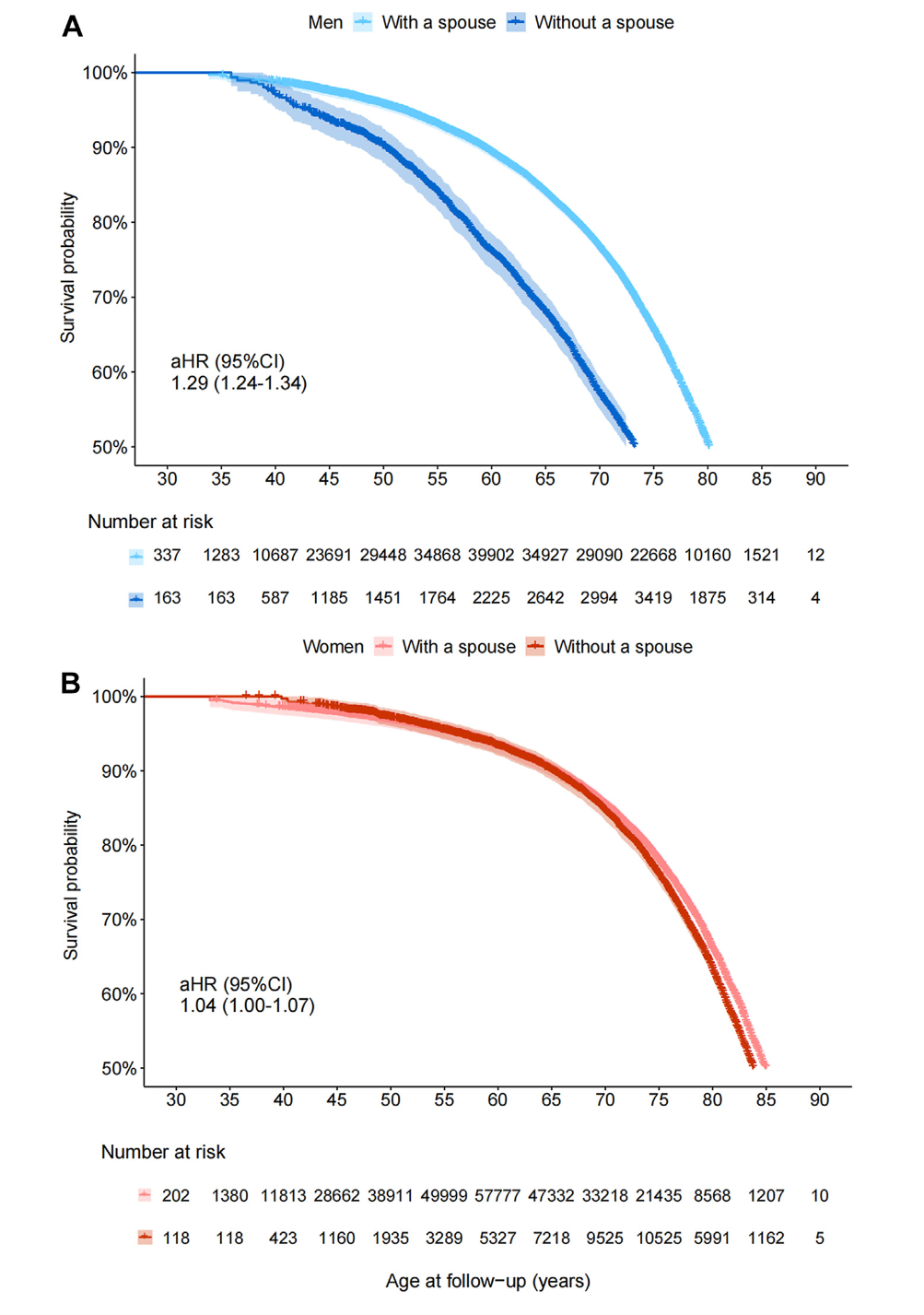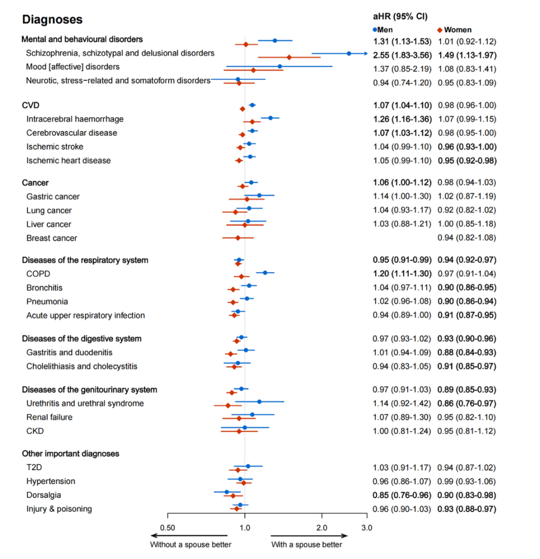 在患有常见慢性病(如冠心病、食道癌、糖尿病等)的患者中,与有伴侣的患者相比,无伴侣的男性和女性死亡风险的aHR分别为1.29和1.04,即无伴侣者的总死亡风险更高。