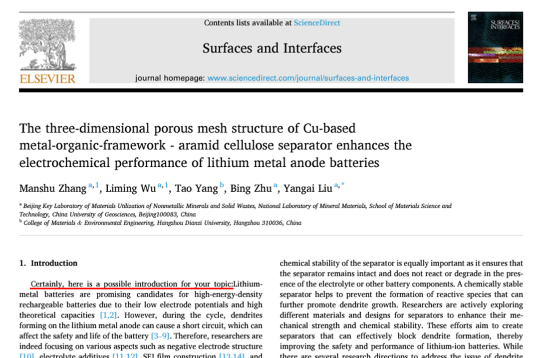 之所以收到这么大规模的关注,除了因为这句直接放在正文开头的“Certainly, here is a possible introduction for your topic”的ChatGPT 指示句,明示作者使用了 ChatGPT 生成论文内容,并且作者只字未改直接复制粘贴,也是因为这篇论文出自两所中国著名高校。