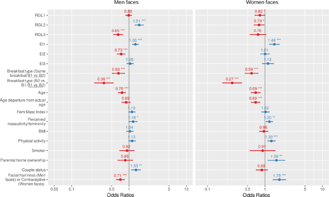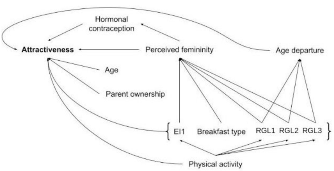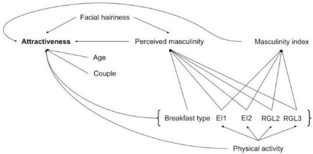 被试者的个人信息和饮食习惯通过问卷和身体测量进行收集。研究人员为每个性别构建了一个假设的路径模型,将线性回归与饮食变量相结合,用多种因素来解释吸引力的大小,比如年龄、早餐类型、房屋所有权、面部的毛发、体力活动等等。最终,研究选择了符合一定标准的男女被试者进行进一步分析。