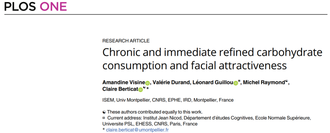 [1]. Visine A, Durand V, Guillou L, Raymond M, Berticat C. Chronic and immediate refined carbohydrate consumption and facial attractiveness. PLoS One. 2024;19(3):e0298984. Published 2024 Mar 6. doi:10.1371/journal.pone.0298984
