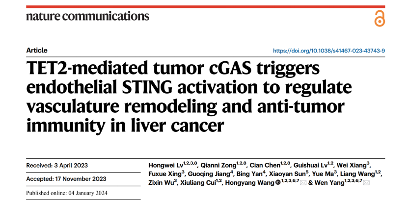 Lv, H., Zong, Q., Chen, C. et al. TET2-mediated tumor cGAS triggers endothelial STING activation to regulate vasculature remodeling and anti-tumor immunity in liver cancer. Nat Commun 15, 6 (2024).
