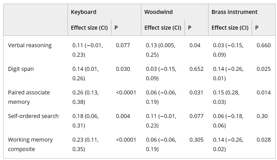 研究显示:对“演奏”因素问题做出积极反应的参与者在工作记忆和执行功能任务中表现明显更好,其学习能力、检索能力、工作记忆能力以及语言推理能力较强。其中,在“演奏”中,演奏键盘乐器和木管乐器(单独或与其他乐器结合)的参与者与认知表现的关联性更强。进一步,研究人员还发现:演奏单一乐器的参与者和演奏多种乐器的参与者认知表现无明显差异。