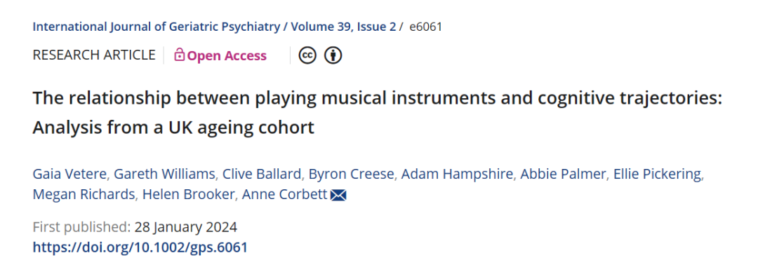 [1] Vetere G, Williams G, Ballard C, et al. The relationship between playing musical instruments and cognitive trajectories: Analysis from a UK ageing cohort. Int J Geriatr Psychiatry. 2024;39(2):e6061. doi:10.1002/gps.6061
