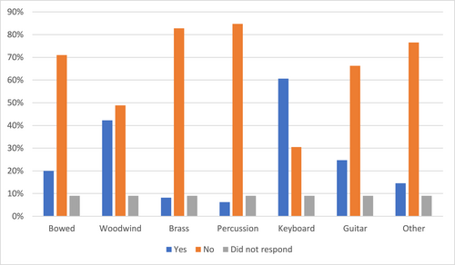 乐器方面:ELMEQ问卷数据显示,89%的参与者有演奏乐器的经验,44%的参与者目前仍在继续演奏。44%的人参与了器乐团体的音乐活动。28%的参与者只会演奏一种乐器,23%的参与者会演奏两种乐器,4%的参与者会演奏五种及以上乐器。其中,很多参与者演奏的乐器是键盘乐器或木管乐器。