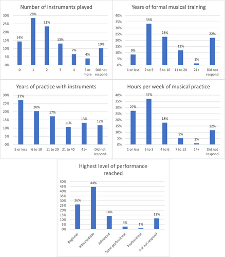 时间方面:78%的参与者报告说接受过正规的音乐培训,培训持续时间常为2至5年。此外,大多数参与者一生中玩乐器的年限较为有限,最常见的是五年或更少(27%)。在他们经常演奏乐器的这些年里,每周练习时间约为2-3个小时(37%)或更少(27%)。