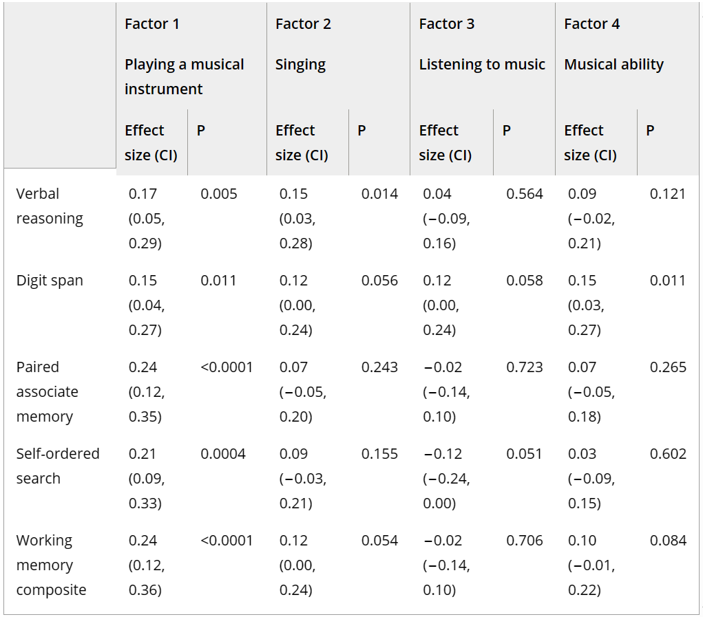 关于其他音乐因素,歌唱和执行功能之间存在相关性。较高的音乐能力也与数字相关的工作记忆任务呈正相关。听音乐与认知表现之间没有统计学上关联。